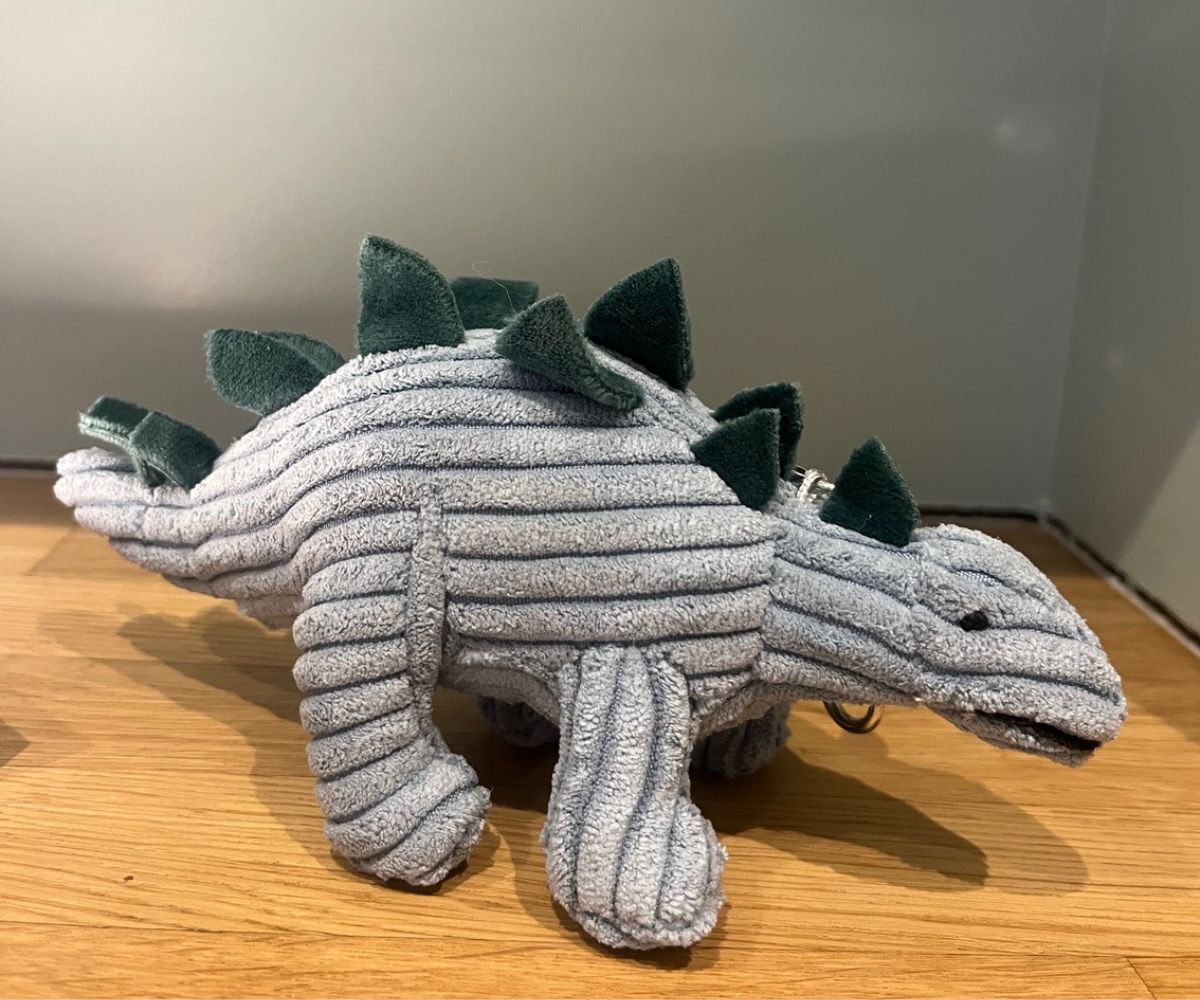 A soft and cheerful blue corduroy stegosaurus dinosaur bag charm that brings a playful pop of character to any tote, backpack or set of keys. Made with tactile corduroy and finished with sweet stegosaurus spikes, this cute dinosaur keychain is perfect for kids, dino lovers, and anyone who enjoys cute accessories. Lightweight, durable and easy to clip on, it makes a thoughtful dinosaur gift, a fun school bag charm, or a unique little treat.