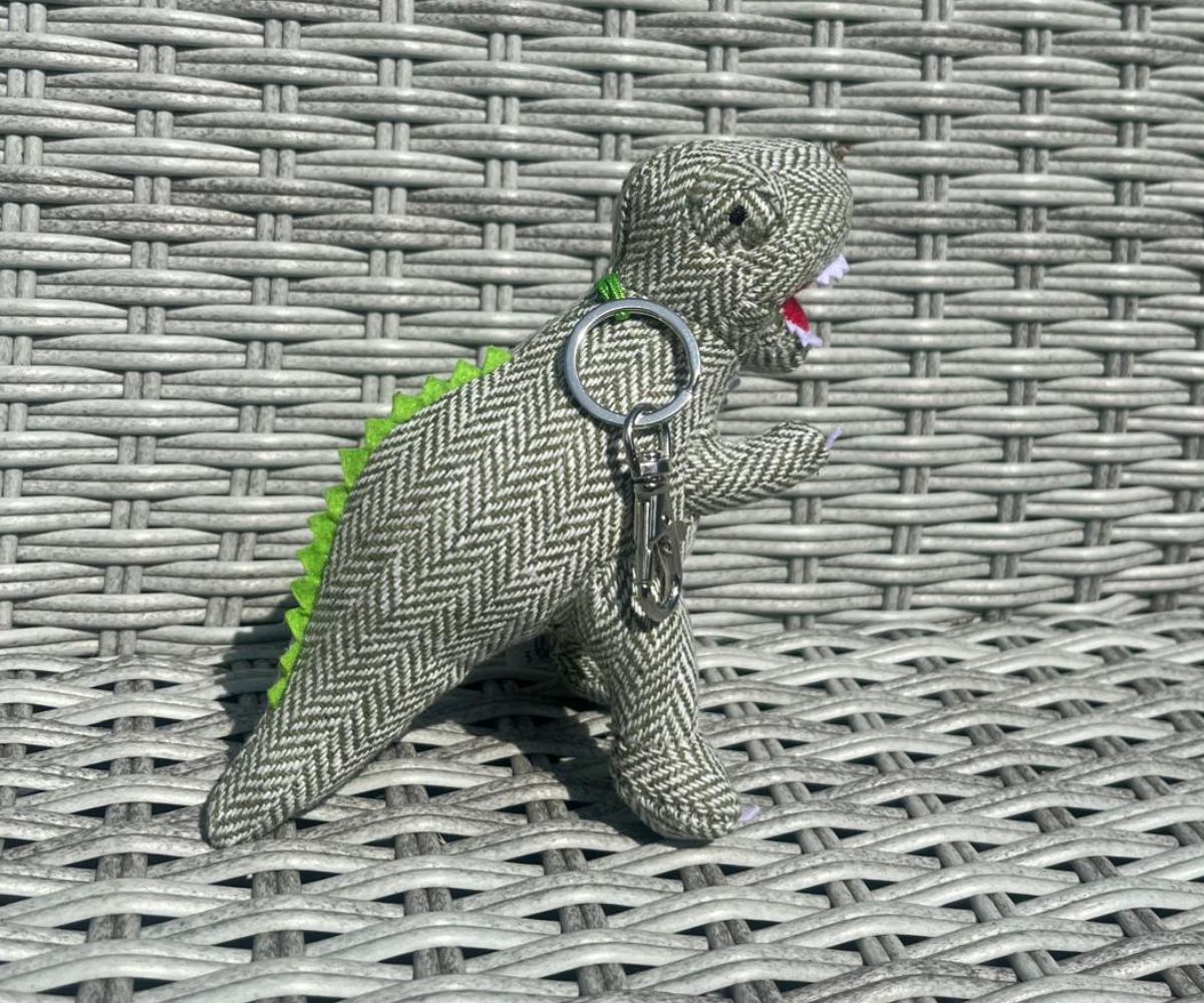 Variations: knitted bee, tartan blue/green bunny, tartan white bunny, sausage dog, tweed highland cow, tartan highland cow, pink tweed diplodocus, corduroy highland cow, corduroy stegosaurus, corduroy sausage dog, corduroy bunny, tweed T Rex