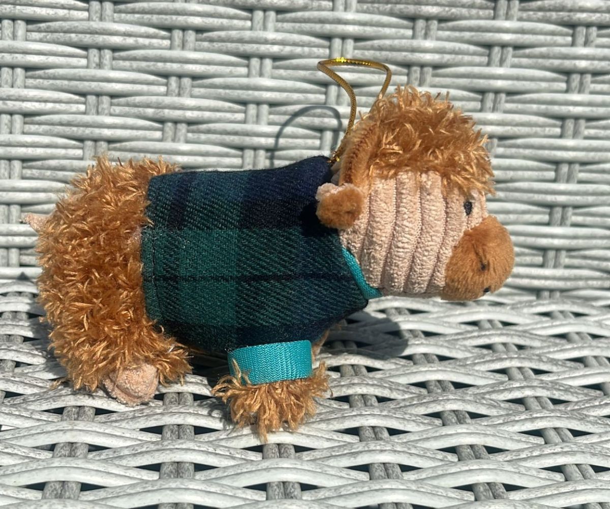 Our corduroy highland cow hanging decoration has a smart tartan knitted jumper. Like our highland cow soft toys and baby rattles, this hanging decoration has the distinctive long, wavy hair, curved horns, and expressive eyes of these iconic Scottish cattle. An ideal small gift for fans of Highland coos.